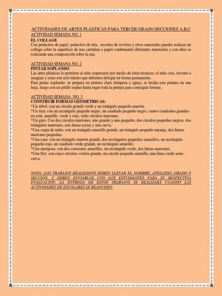 Es importante para el desarrollo de los pequeños permitirles, los espacios, recursos, la libertad de poder expresarse por medio de cualquier tipo de manualidad acorde a su edad. Las fonéticas incluyen expresión escrita del lenguaje, recitación, música y canto. Por medio de las manualidades para los niños estos pueden poner cuidado a lo que les dicen para poder realizar la actividad de forma acertada. Las artes plasticas en 4° de educacion primaria. El profesor guatemalteco eugenio aragón, considera 3 etapas metodológicas del arte: La importancia de las artes plásticas. El arte es importante para la estimulación del desarrollo de la parte creativa del cerebro, ayuda al estudiante a ser creativo, a tener su autoestima alta y a ser libre de expresar su vida, sus emociones, como se sienten, si triste, alegre, con coraje y pueden comunicar. Las actividades creativas son excelentes para niños pequeños y preescolares que no pueden o no quieren quedarse quietos y desean crear. Las actividades relacionadas con el arte se vuelven mucho más complejas y particulares cuando los niños pequeños se convierten en preescolares... 7.2las maestrillas viernes, 3 de octubre de 2014.